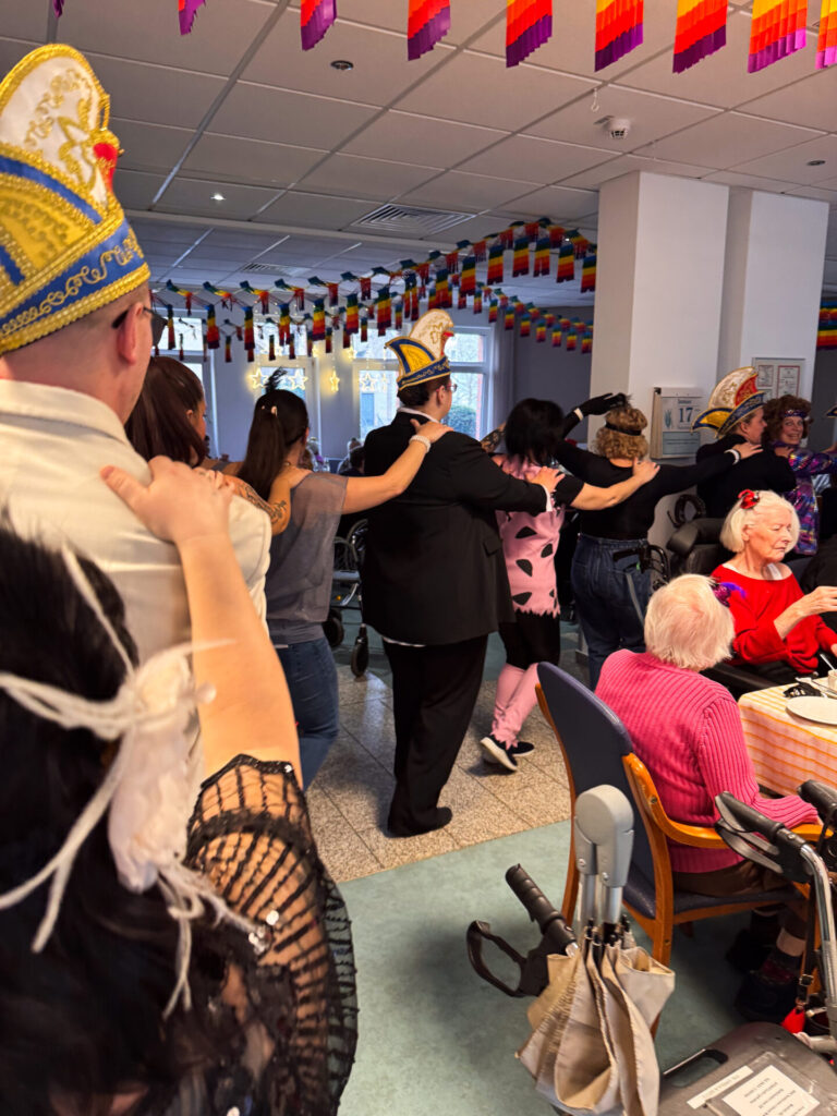 Zwischendurch stärkten sich alle bei Kaffee und leckeren Fastnachtsküchle aus unserer ausgezeichneten 3-Sterne-Küche. Dieser Energieschub war auch nötig, denn Faschings-Musikhits wie „Good Mood“ von den GroßstadtEngeln samt Polonaise des DSK-Teams brachten den Saal zum Kochen und kaum jemand hielt es still auf seinem Platz aus. Fastnacht im Seniorenzentrum bedeutet eben nicht nur Zuschauen, sondern Mitmachen 🙂